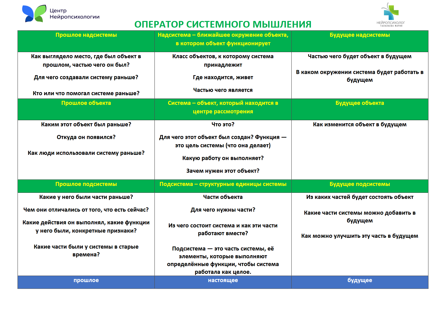 Оператор системного мышления, или системный оператор, — это один из ключевых инструментов ТРИЗ (Теории решения изобретательских задач), который помогает развивать системное мышление у детей и взрослых. Этот метод позволяет рассматривать любой объект или проблему как систему, анализируя её во времени (прошлое, настоящее, будущее) и пространстве (надсистема, система, подсистема). Он учит находить взаимосвязи, выявлять ресурсы и решать задачи творчески, избегая шаблонных подходов.