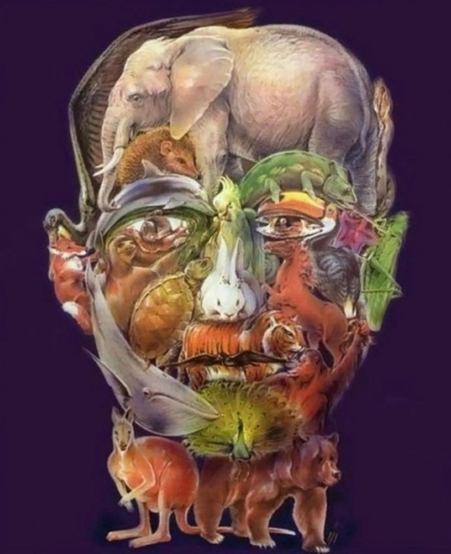 На эту головоломку неизвестного создателя явно вдохновил итальянский живописец Джузеппе Арчимбольдо. Только он складывал свои картины из неживых плодов, овощей, цветов и веток, а современный автор сложил свою голову из живых животных. Получилось найти на картинке 25 животных?