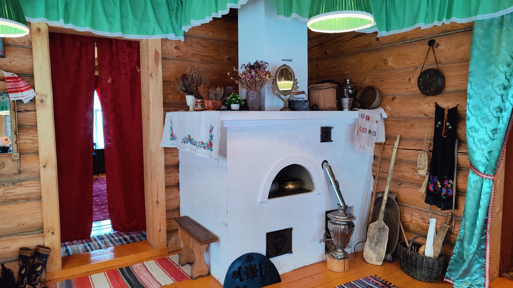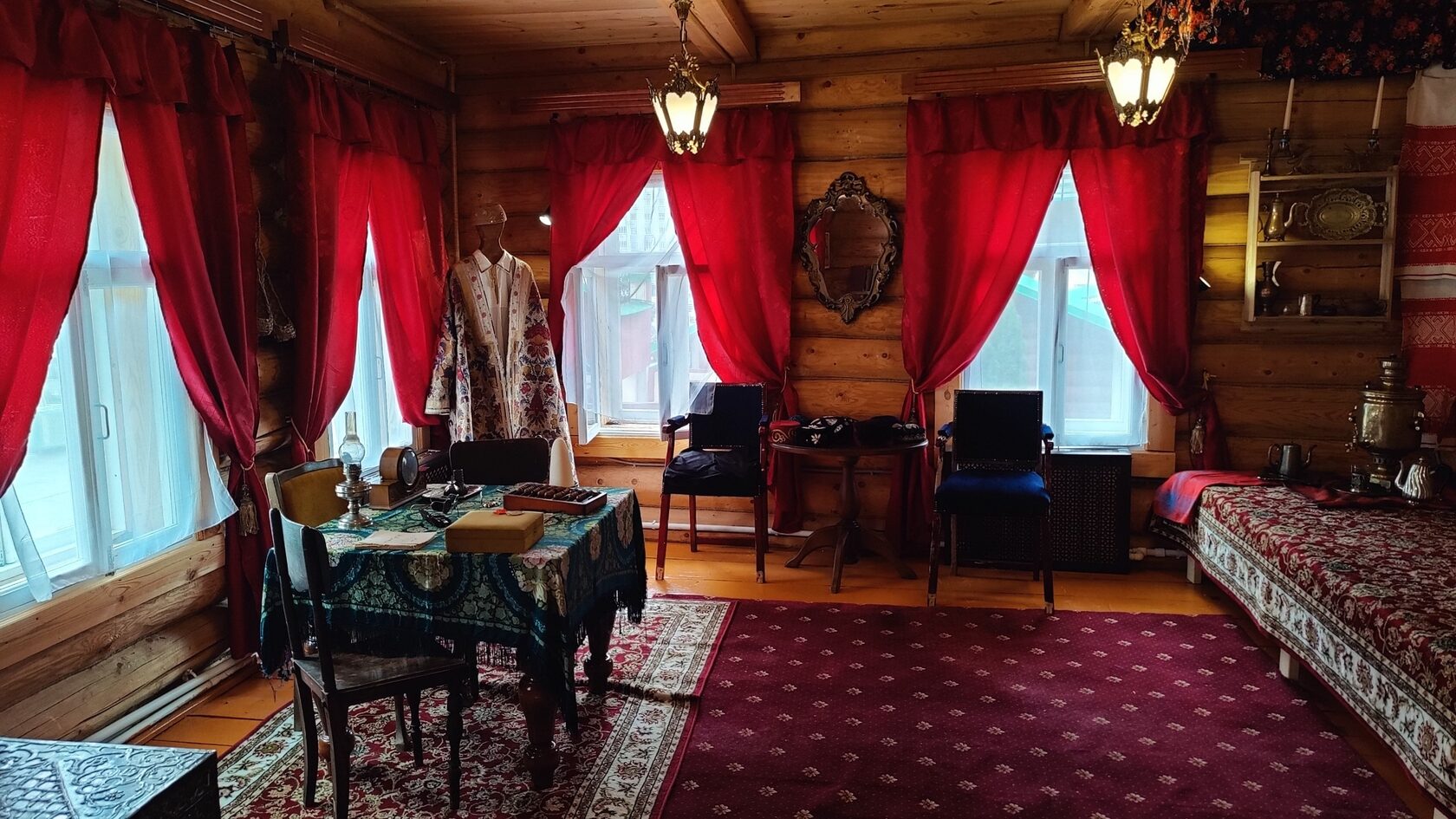 Дождь чуть стих, и мы пошли пешком через Баумана, мимо озера Кабан, чьё название связано с легендой о хане Кабане, правившем здесь в XIII веке, когда Волжская Булгария была центром торговли. Через 20 минут, слегка промокшие, мы добрались до дома Муллина — старинного особняка, где в XIX веке жили богатые татарские купцы, такие как Юнус Муллин, чья семья сыграла ключевую роль в развитии торговли Казани. Приехали раньше и попали на экскурсию по интерьерам того времени: старинная мебель, посуда, одежда — всё как будто перенесло нас в 1870-е годы, когда Казань стала важным узлом на Волге.
